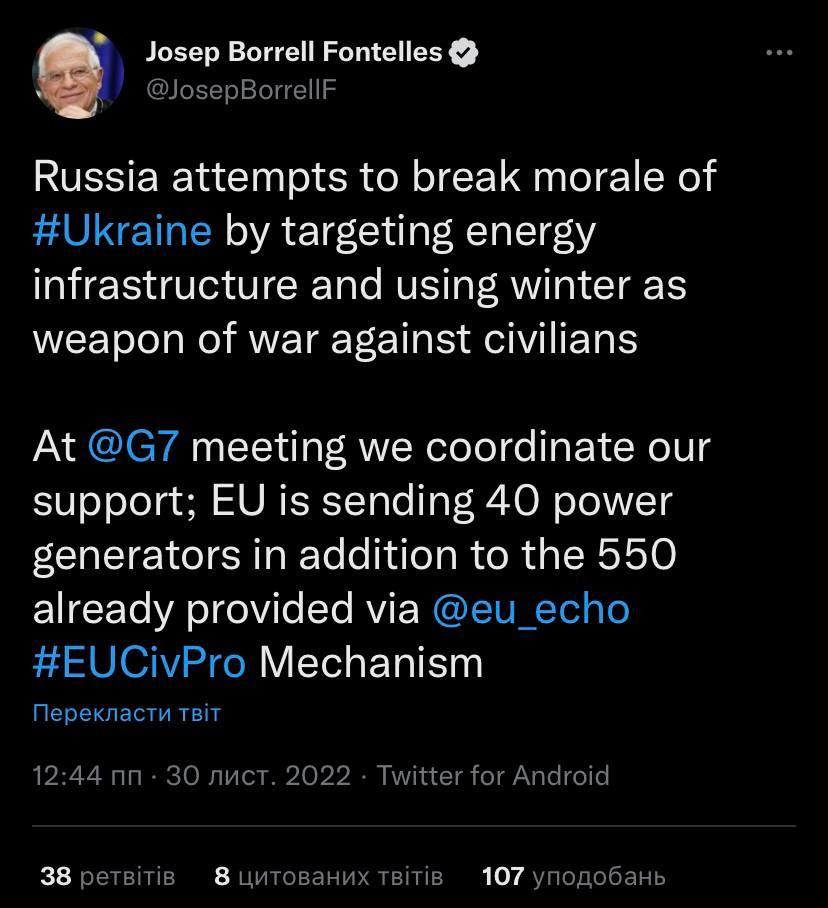 "Росія намагається зламати дух українців, б’ючи по енергетичній інфраструктурі та використовуючи зимові умови як зброю проти цивільного населення", – написав Боррель.